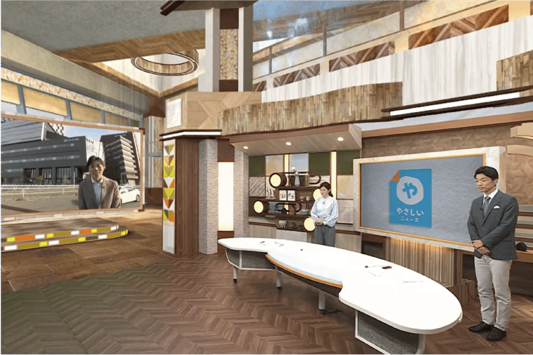 株式会社アイネックス様にて制作されたバーチャルCG背景例。テレビ大阪株式会社様『やさしいニュース』(左)と株式会社岩手朝日テレビ様『スーパーJチャンネルいわて』(右)。いずれの背景もリアルセットとバーチャルセットとのハイブリッド