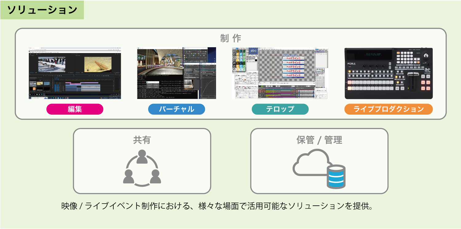 映像/ライブイベント制作における、様々な場面で活用可能なソリューションを提供。また、外部サービスとも連携することで、より幅広く効率的な制作環境を整えることが可能。