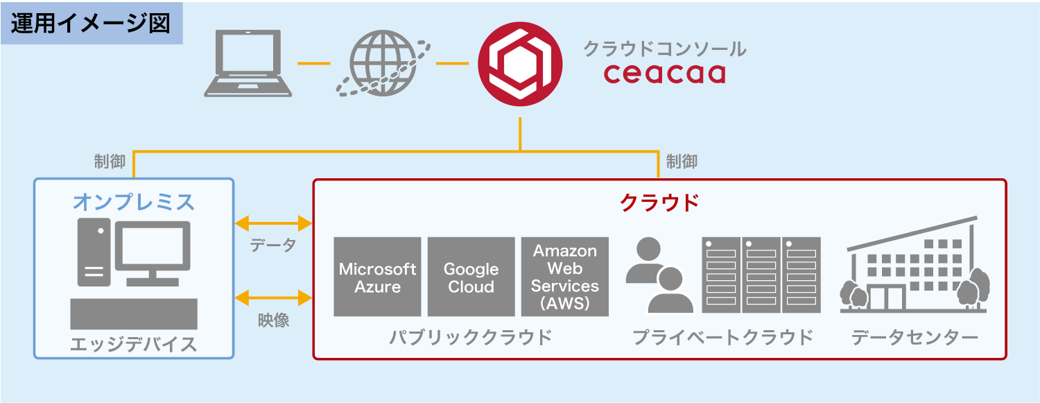 他クラウドサービスとの連携に強いパブリッククラウド、柔軟に構築可能なプライベートクラウド、専用回線で安定運用が可能なデータセンターなど、各種プラットフォームとの連携が可能。求めるシステム、用途、予算に合わせたプラットフォームの使用が可能で、ceacaa というコンソールを入り口に、パブリッククラウドとプライベートクラウドのハイブリッド構成等にも柔軟に対応可能。最初はパブリッククラウドを使用し、後々プライベートクラウドやデータセンターへ移行といった運用にも対応。