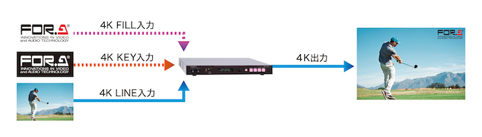 • 入力:LINE入力 (3G/HD-SDI x 4)、FILL/KEY入力 (各3G/HD-SDI x 4) ・4K(QFHD)時:LINE 1系統、FILL/KEY 各1系統 ・HD(3G/1.5G)時:LINE 4系統、FILL/KEY 各4系統