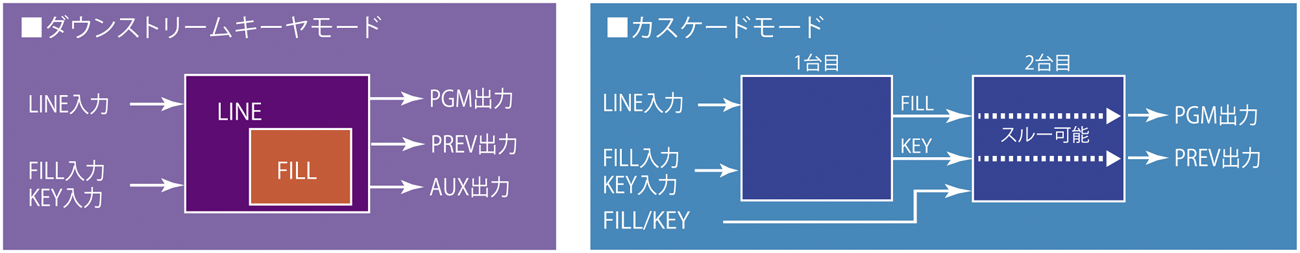 - 2つの動作モード – DSKモード:ライン入力にタイトルをスーパーインポーズしてPGM、PREVに出力 – カスケードモード:複数のタイトル入力を合成してFILLとKEYを出力 (設定によりPGM、PREV出力又はFILL、KEY出力切替が可能)