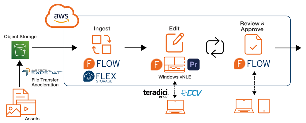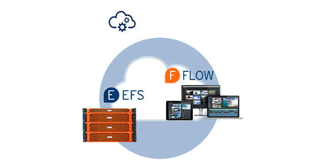 EditShare FLEXは、クラウドサービス(AWS)を制作ワークフローにおいて最大限に活用するためのメディア資産管理(FLOW)およびストレージ(EFS)を統合し構築されるソリューション。オンプレミスでの信頼とパフォーマンスに優れたEFS Storage環境をそのままクラウド上で実現します。