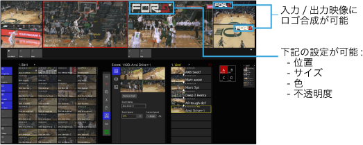 グラフィックオーバーレイ機能により、入力/出力映像にロゴの合成が可能。png、jpgの取込みに対応し、位置/サイズ/不透明度等を自由に設定可能。