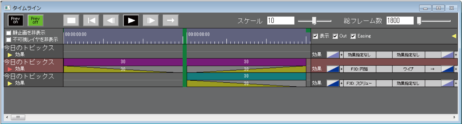 各オブジェクトの動作範囲、動作開始終了位置や効果時間を、タイムラインで設定することが可能。