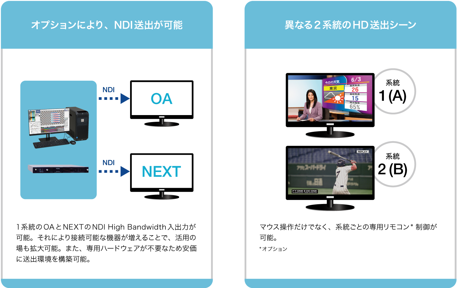 - 多系統送出*:1系統で複数レイヤーの送出制御が可能。各レイヤー毎に番組を開いて制御し、最大8レイヤー制御が可能。
