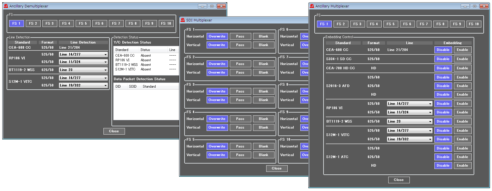 FA-1010を見て誰もが驚くのが、1Uの筐体内に10系統ものプロセス機能が内蔵されていることではないでしょうか。単純に10個のプロセッサが1台の筐体に入っただけでなく、10系統の相互内部回路を搭載している点が特長です。システム構築を行うために必要な各種プロセッサやクリーンスイッチ機能を余すことなく実装し、ケーブルをつなぐことなく各チャネルの相互信号処理が可能です。また、アンシラリデータとオーディオは、映像とは別々に処理されるため、信号処理によって字幕、タイムコードなどのアンシラリデータが消される心配もありません。