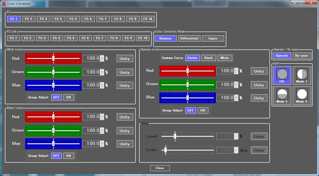 カラーコレクションモードは3種類。単独またはグループでの色調整が可能です。パラメータの差を保ったまま各チャネルをリンクすることも可能です。