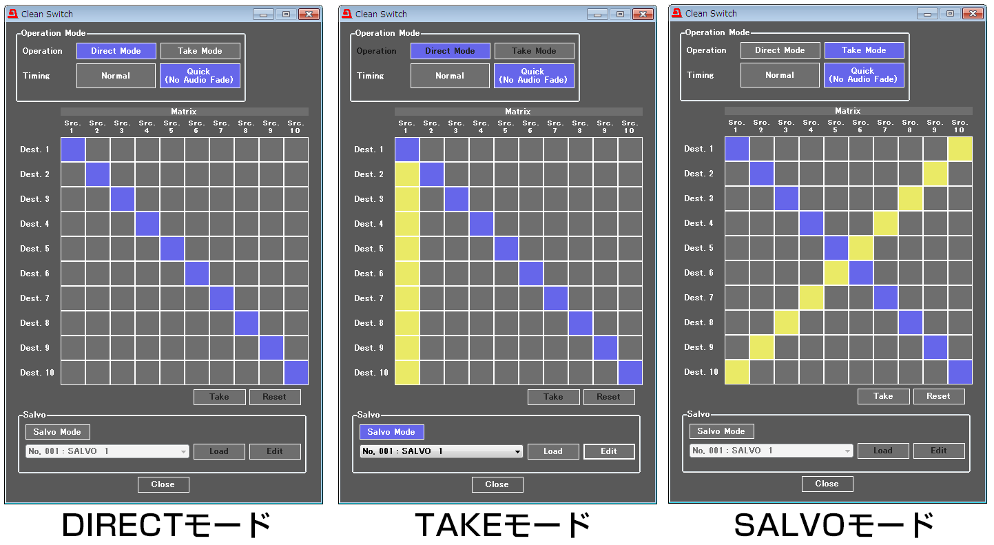 出力部にはクリーンスイッチを搭載。映像、音声ともにノイズやショックなく、スムーズな切り替えを実現します。切り替え方法は、クロスポイントを直接操作するダイレクトモードのほか、TAKE操作で一括切り替えを行うTAKEモード、さらに、クロスポイント設定を保存し、一括で切り替えるSALVOモードを搭載。プロセス処理付きのルーティングスイッチャとしても十分に活用可能です。