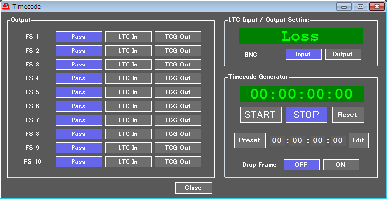 タイムコードは、外部からのLTCタイムコード入力のほか、内蔵のタイムコードジェネレータを選択できます。チャネルごとにPass、外部TCまたは内蔵TCに準拠するかどうかを選択可能。また、搭載のLTC端子は外部LTC入力のほか、内蔵TCの外部出力として利用することも可能です(選択式)
