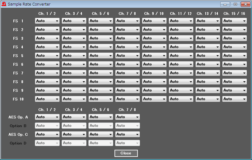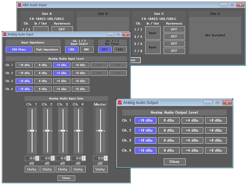 FA-10AES-UBLに対し本オプションを実装することにより、16チャネル(8入力8出力)の構成が可能。FA-10AES-UBLの右隣のオプションスロットにのみ実装可能です。