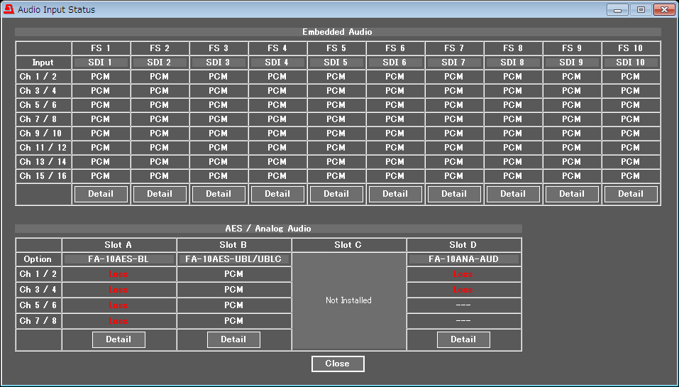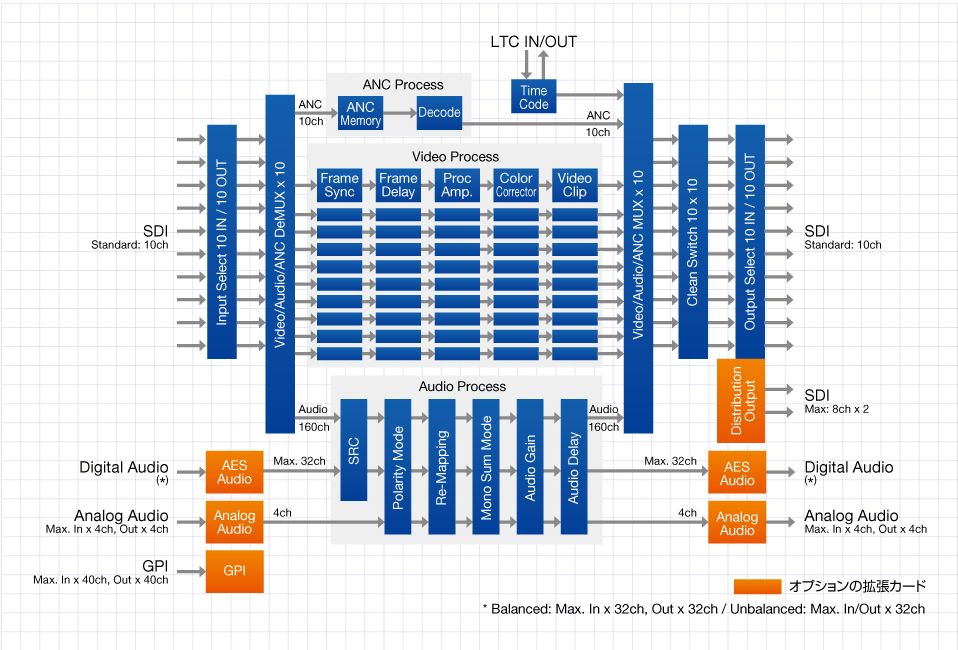 エンベデッドオーディオは、3G/HD(同期/非同期)、SD-SDI*(同期) 1系統あたり16チャネルに対応。10系統すべて合わせると最大160チャネルものオーディオ入力を処理可能なパワフルな性能を有しています。