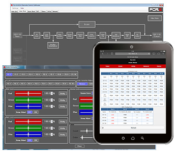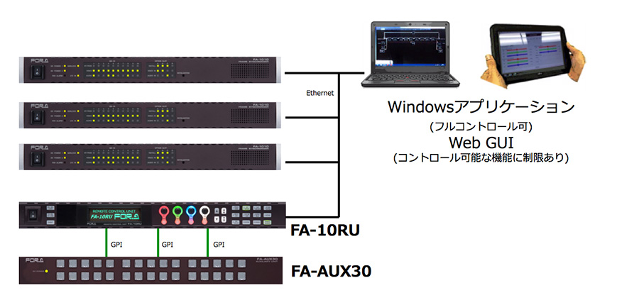 リモートコントロールパネルFA-10RUを用いることで複数台の制御が可能。FA-AUX30を用いれば、各種操作へのショートカットを提供。