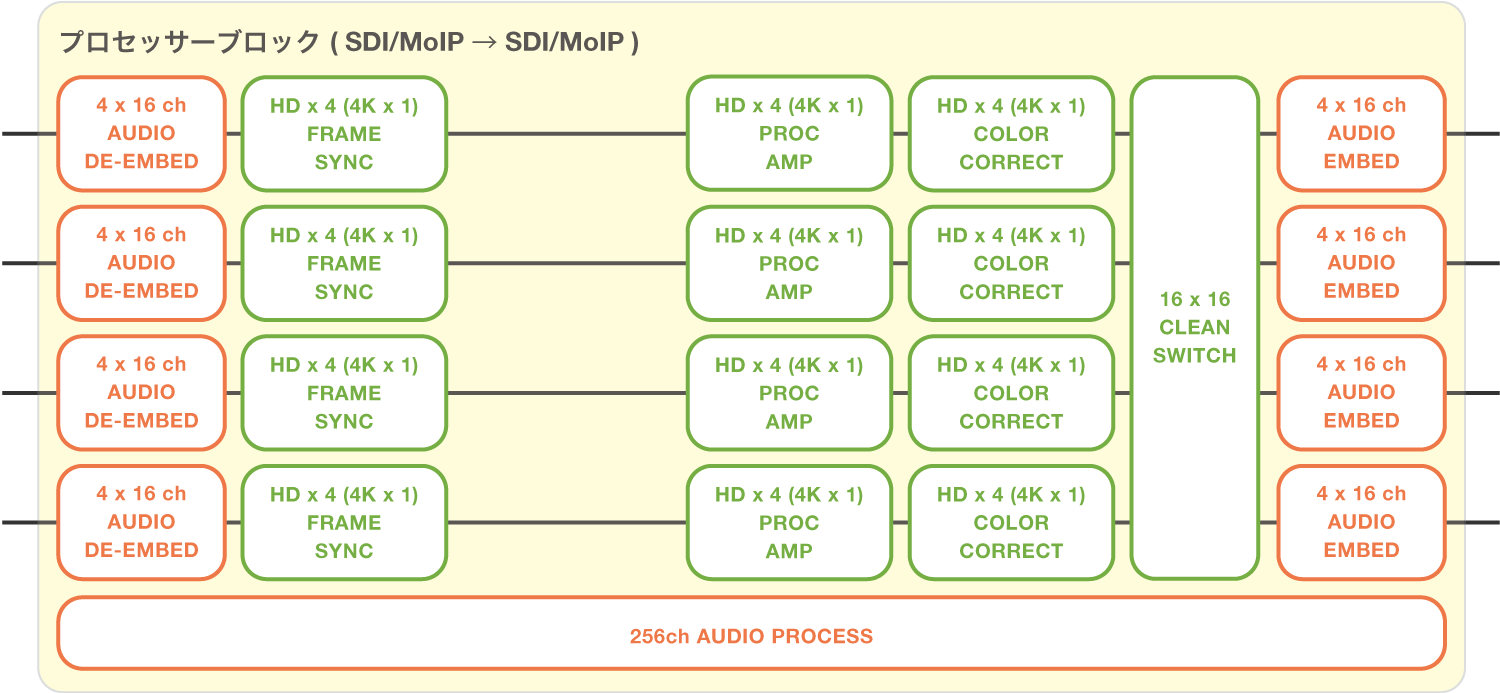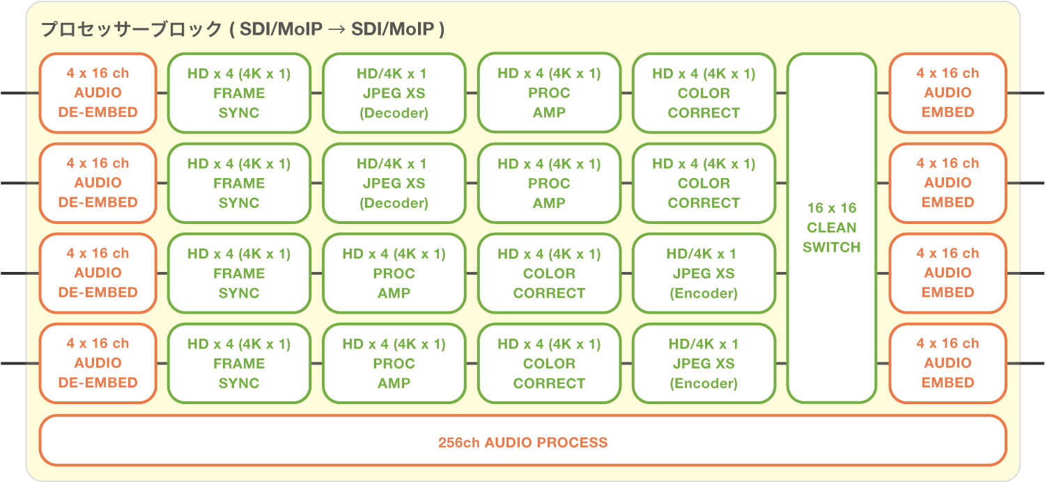 SDIおよびMoIPに出力するビデオとオーディオを処理する2つのブロック。それぞれのプロセッサーブロックには、用途や必要な機能に応じて同じコンフィグレーション/異なるコンフィグレーションのどちらを設定することも可能。各プロセッサーブロックには、最大4つのプロセッサーをユニットを搭載。