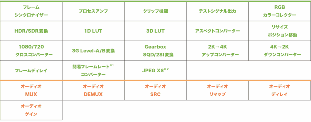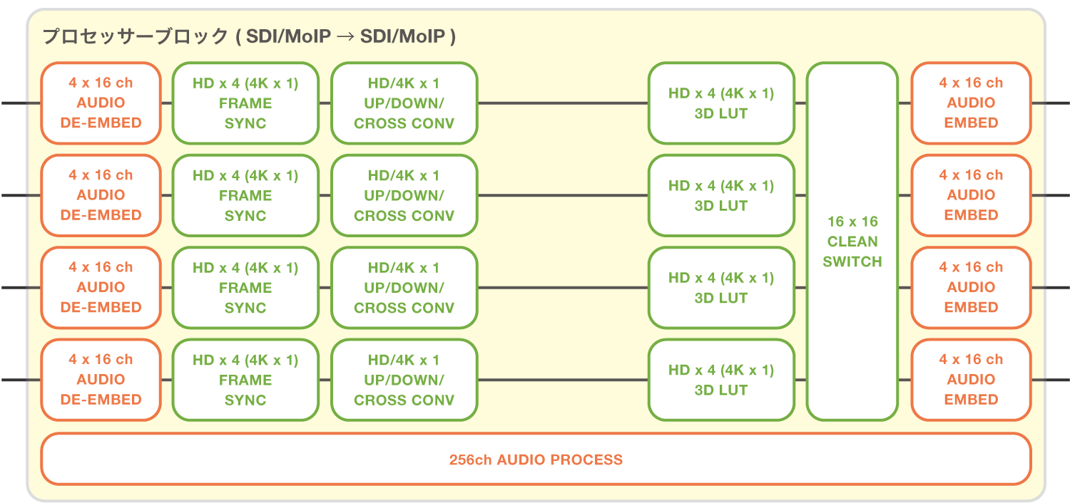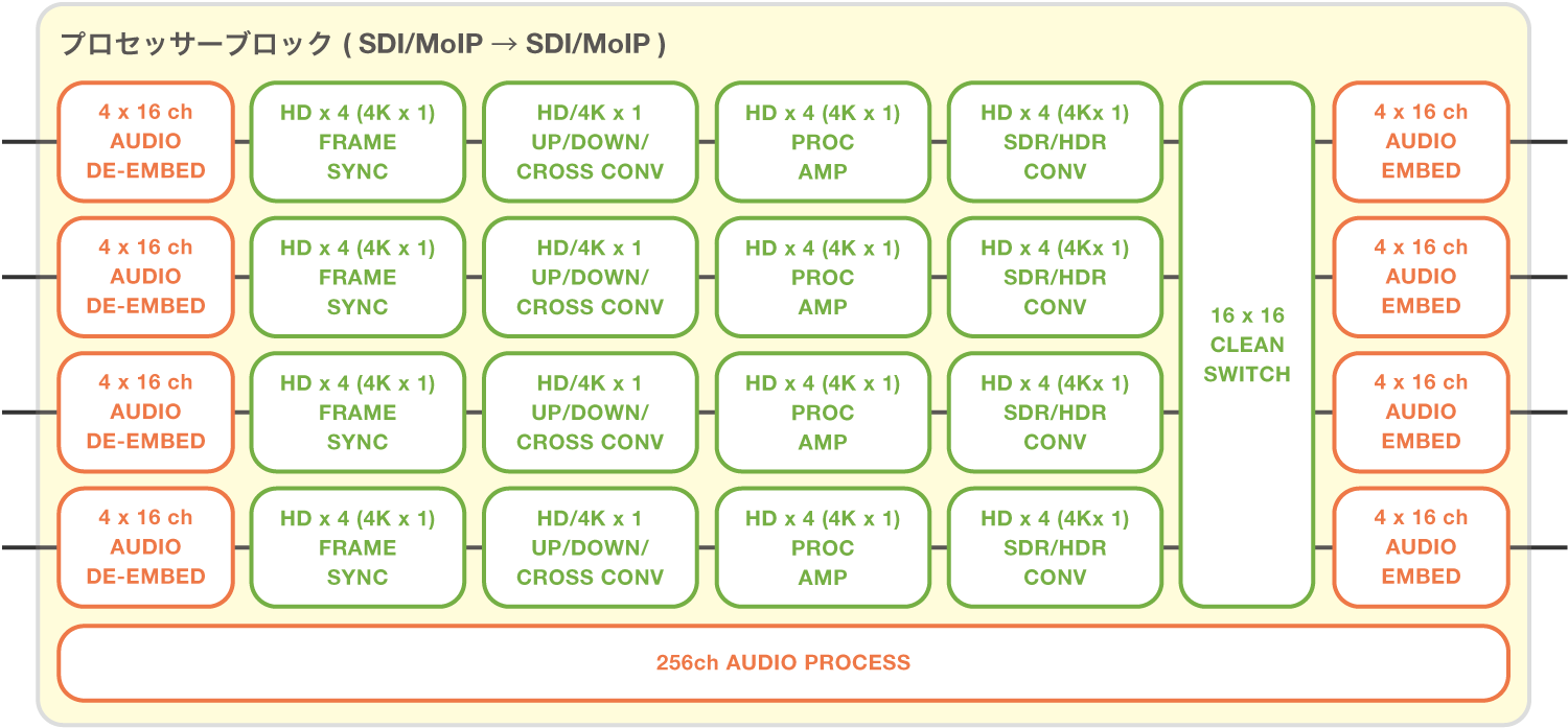 コンバーター機能(アップ/ ダウン/クロス/アスペクト変換/リサイズ等)を使用する場合、HD/4K のどちらの場合も1つのプロセッサーで処理できる系統数は1系統のみとなります。