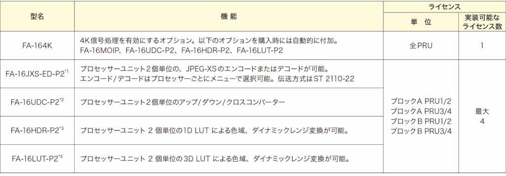 – プロセッサーブロックAとBに最大で合計4つのFA-16UDC-P2を搭載可能 - FA-16HDR-P2*:SDR/HDR変換機能を有効化