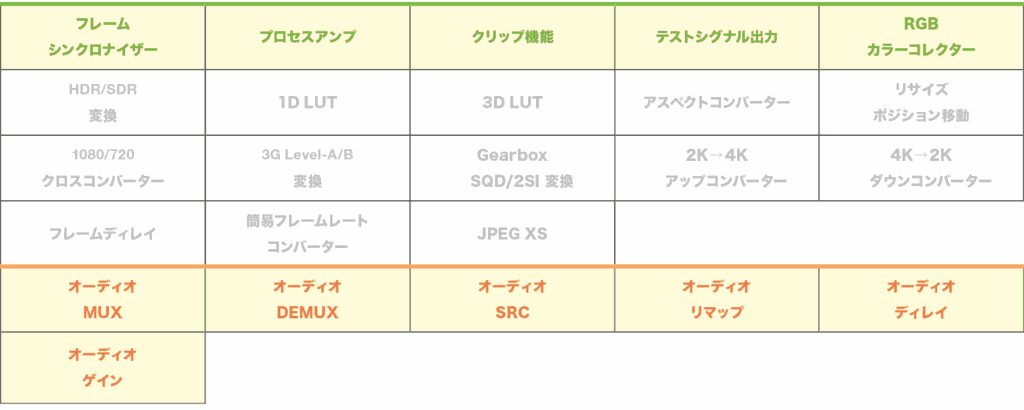 映像プロセッサーブロックに構成可能な機能一覧