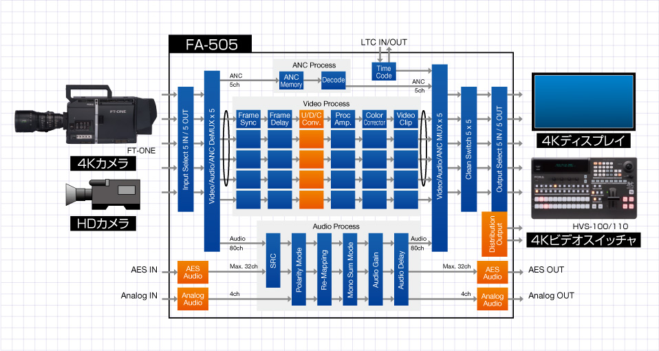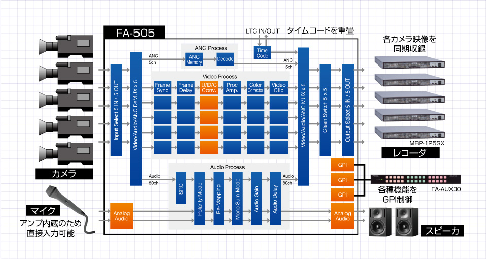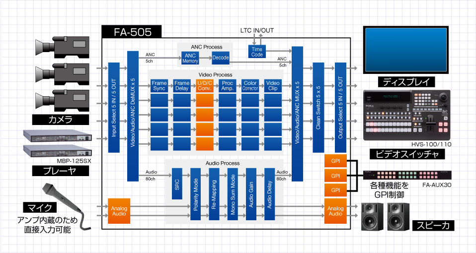 ノンリニアでの編集が主流となった現在では、ビデオシステムはシンプルになりつつあります。ただ、シンプルにしすぎたことで、実際の作業の際に「こんな機能があったら便利だったのに」、といった悩みや要望を感じたことがあるかもしれません。FA-505が1台あれば、ビデオ、オーディオに関する様々な機能を包括し、皆様の「こんな機能があったら」という不測の事態に備えることができます。