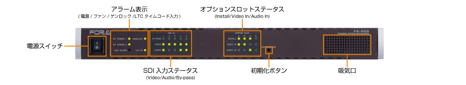 FA-505は、映像制作に必要とされる多彩な機能を搭載する一方、多チャネルルーティング(ビデオ入力 x 5・出力 x 5)をも可能にするフレームシンクロナイザです。