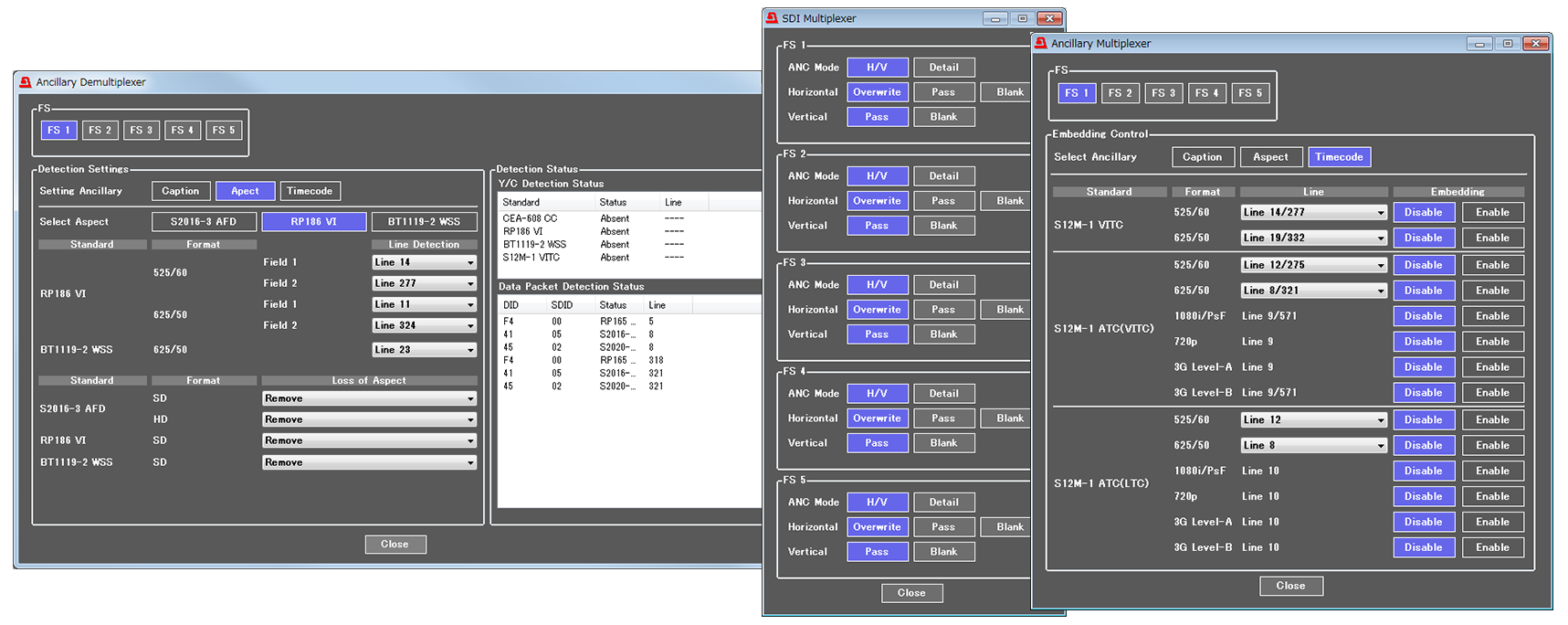 FA-505は、10入力10出力、10チャネルのプロセス回路を有するFA-1010の姉妹モデルです。5入力5出力、5チャネルのプロセス回路を有し、FA-1010にはないアップ/ダウン/クロス/アスペクトコンバータ機能(オプション)を搭載可能な点が特長です。FA-1010同様に、単純に5個のプロセッサが1台の筐体に入っただけでなく、5系統の相互内部回路を搭載しています。システム構築を行うために必要な各種プロセッサやクリーンスイッチ機能を余すことなく実装し、ケーブルをつなぐことなく各チャネルの相互信号処理が可能です。また、アンシラリデータとオーディオは、映像とは別々に処理されるため、信号処理によって字幕、タイムコードなどのアンシラリデータが消される心配もありません。