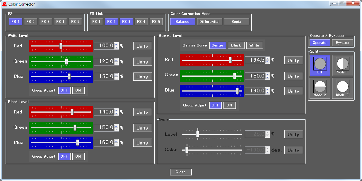 カラーコレクションモードは3種類。単独またはグループでの色調整が可能です。パラメータの差を保ったまま各チャネルをリンクすることも可能です。