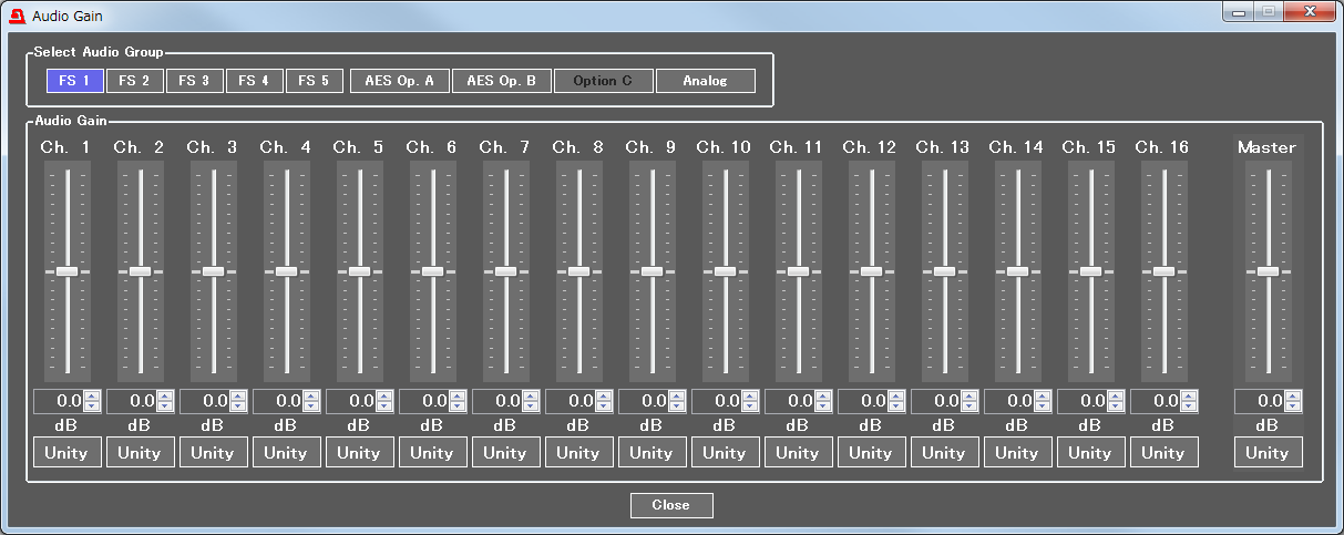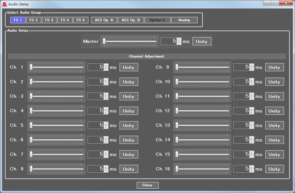 オーディオチャネルごとにディレイ調整が可能です。1ms単位、最大1,000 msまで調整ができます。また、オーディオグループ一括でのディレイ調整も可能です。ボタンを押すだけで基準値に戻すことが可能なUNITYボタンも実装しています。