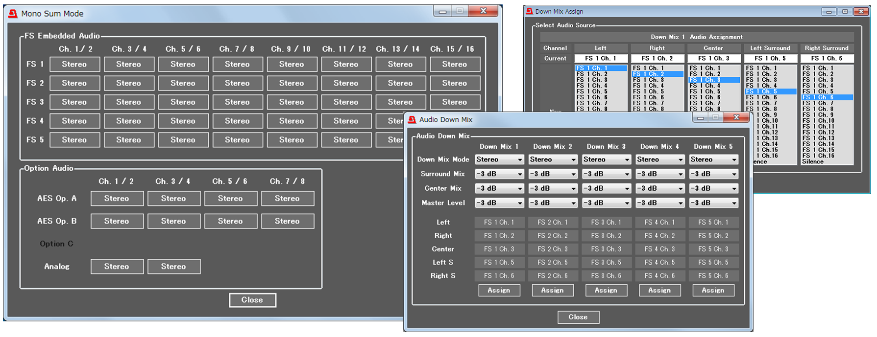 5.1CH音声からステレオへの変換等に便利な機能。L/R/Center/SL/SRそれぞれへのアサインチャネルの変更やゲイン調整、ダウンミックスモードを選択できます。ステレオペアをモノラルに変換するMono Sumモードも搭載しています。