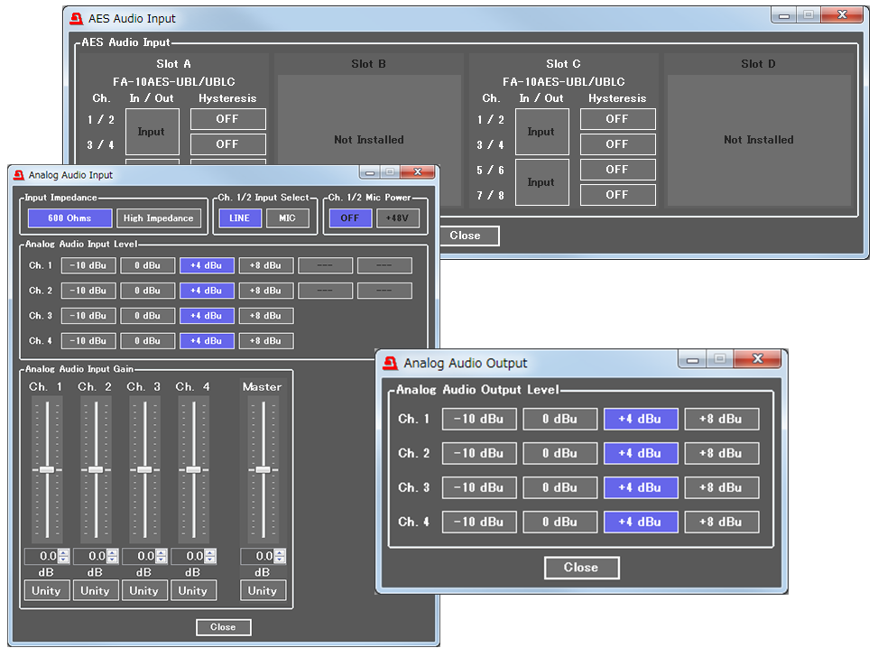 FA-10AES-UBLに対し本オプションを実装することにより、16チャネル(8入力8出力)の構成が可能。FA-10AES-UBLの右隣のオプションスロットにのみ実装可能です。