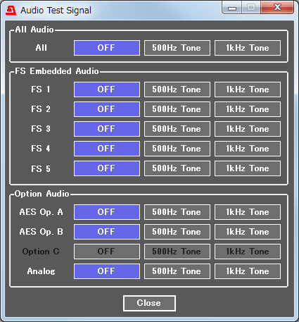 ビデオチャネルまたはオーディオオプションごとに500Hz、1kHz基準信号を出力することが可能です。また、オーディオチャネルごとにも基準信号を出力することが可能です。