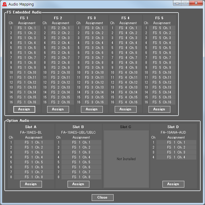 オーディオ信号は各ビデオに対してどのチャネルをアサインするか、オーディオ1チャネルごとにリマッピングが可能です。標準で80チャネル、オプション実装時には最大112チャネルものオーディオを自由にリマッピングできます。ディレイ調整や極性変換もチャネルごとに可能なため、オーディオプロセスのために専用の機器を追加することなくシステムアップが可能です。