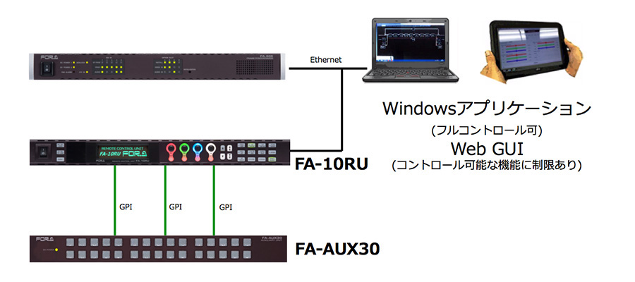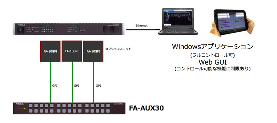 • 外部リモートユニットFA-AUX30を使用することで、GPIによる各種機能へのアクセスも容易です