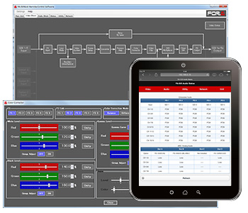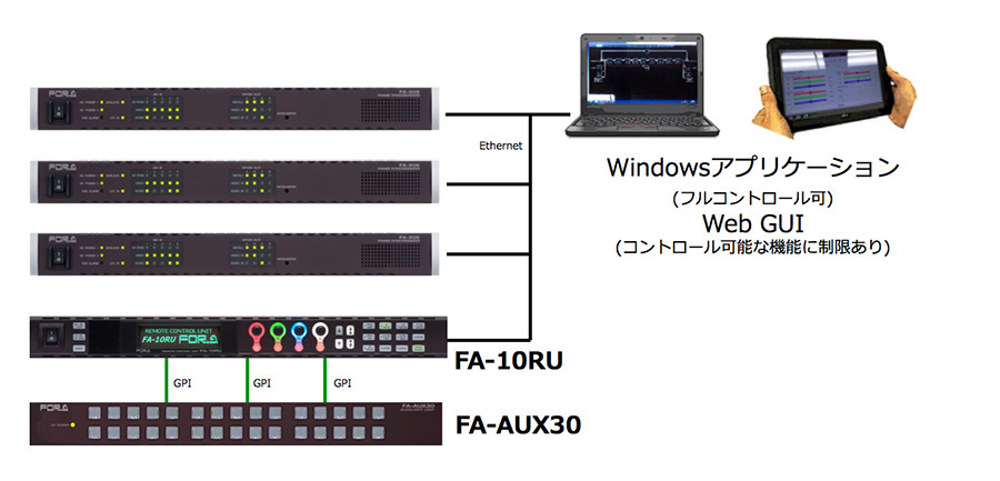 リモートコントロールパネルFA-10RUを用いることで複数台の制御が可能。FA-AUX30を用いれば、各種操作へのショートカットを提供。