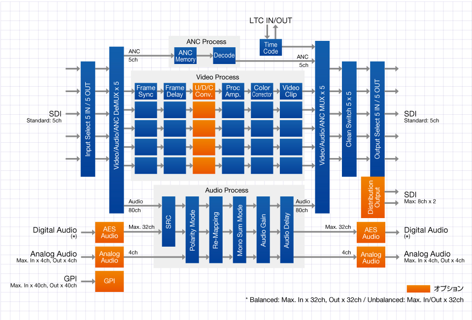 エンベデッドオーディオは、3G/HD(同期/非同期)、SD-SDI*1(同期) 1系統あたり16チャネル、5系統すべて合わせると最大80チャネルものオーディオ入力に対応。SDIエンベッド/デエンベッドをはじめ、オプションを搭載することによりA/D、D/A変換を含めた各種信号処理が可能です。アナログオーディオ入力オプションにはマイク用のヘッドアンプ、ファンタム電源を内蔵しているため、インピーダンス変換等を行う必要なく、また、コンデンサマイクを直接入力することも可能です。またサンプルレートコンバータをはじめ、レベル調整ディレイ調整ダウンミックス*2リマップ極性変換など各種プロセス機能も搭載しています。