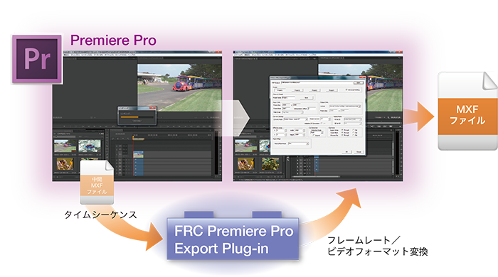 タイムラインから映像ファイルを抽出し、フレームレート変換した後、MXFフォーマットで出力。Windows版Adobe Premiere Pro CC/CS6対応FRCプラグイン。