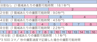 内部メモリは1つの保存領域として利用する以外に、録画領域を分割することで同時録画/再生にも対応します。領域は2〜16まで分割が可能です。連続撮影時は、撮影した映像を残したまま次の撮影を開始します。また、映像を再生しながら、別の領域に新しいシーンを録画可能です。