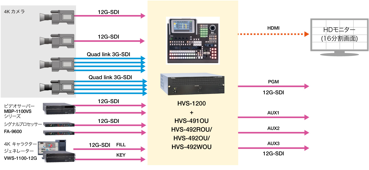 - 4K(UHD)時: 10入力10出力(HDMI 2.0 LEVEL B x 2含む)に対応。2160/59.94p,50pでは、12G-SDIとquad link 3G-SDIの混在入出力に対応。2160/29.97p,25p,24p,23.98pでは、6G-SDIと3G-SDI x2の混在入出力に対応。