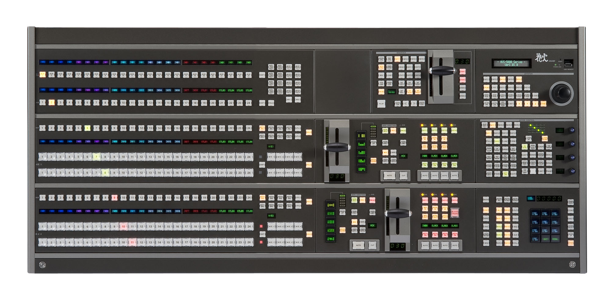 HVS-5000シリーズには2M/E版のHVS-5300A、3M/E版のHVS-5300、4M/E版のHVS-5400の3種類をラインナップ。コントロールパネルは現在のHANABIシリーズの操作系を継承したオペレーションパネルを用意。システム規模や使用用途に応じて様々な組合せのスイッチャシステムを構築することができます。