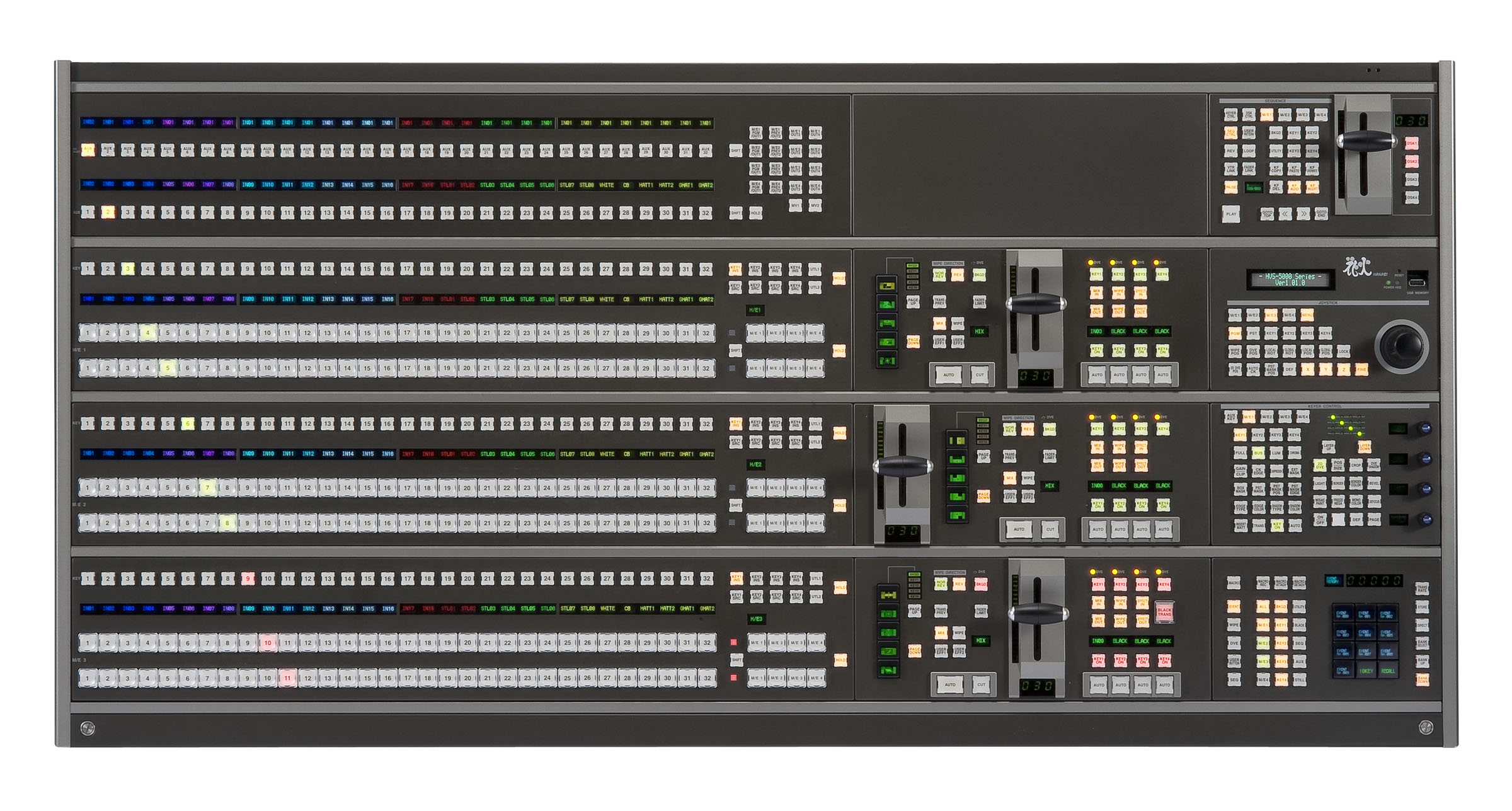 HVS-5000シリーズは2M/Eから4M/Eまでをカバーする真のプロダクションスイッチャです。HD、SD混在入力、3Gbps対応、各M/Eの独立制御、3D DVE、外部機器コントロール、マクロ、そして動画ファイルサポートなど、システムの中核として様々な機能を統合することが可能です。 HVS-5000シリーズが、次世代の映像制作システムを実現します。