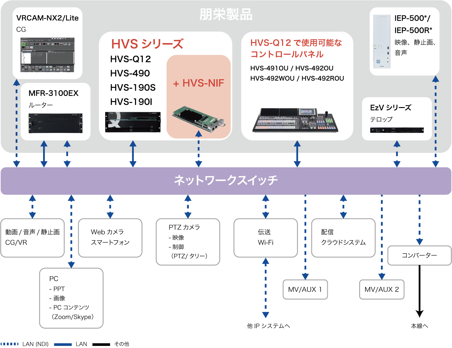 ○HVS-6000 ・M/E:4M/E ・最大入出力:80入力32出力/64入力48出力 ・対応信号:12G/6G/3G/HD-SDI ○HVS-6000M ・M/E:2M/E ・最大入出力:32入力24出力 ・対応信号:12G/6G/3G/HD-SDI