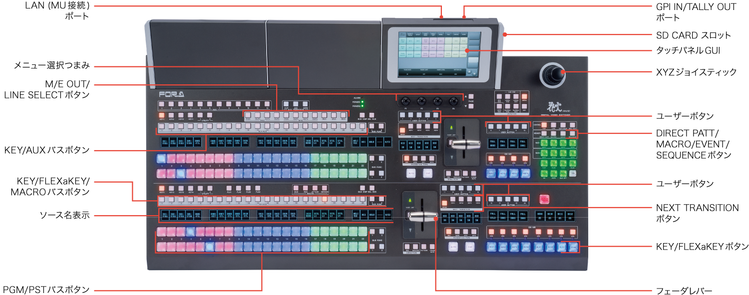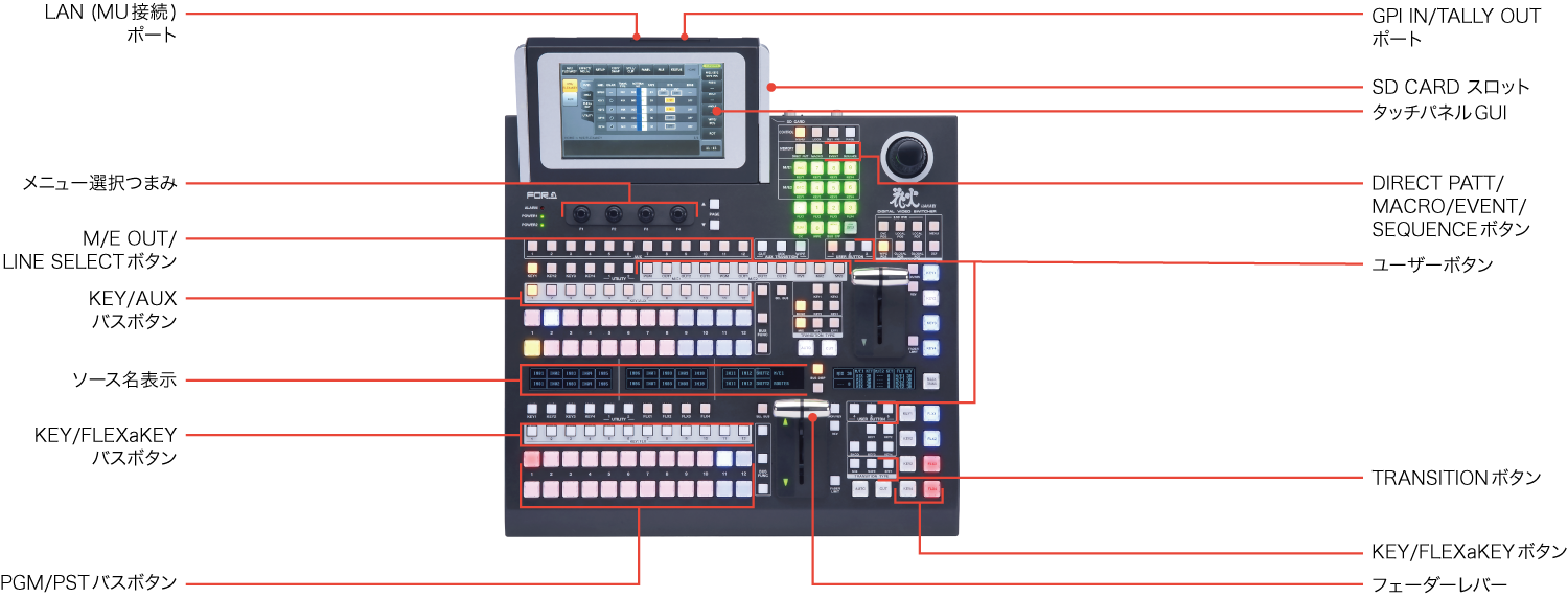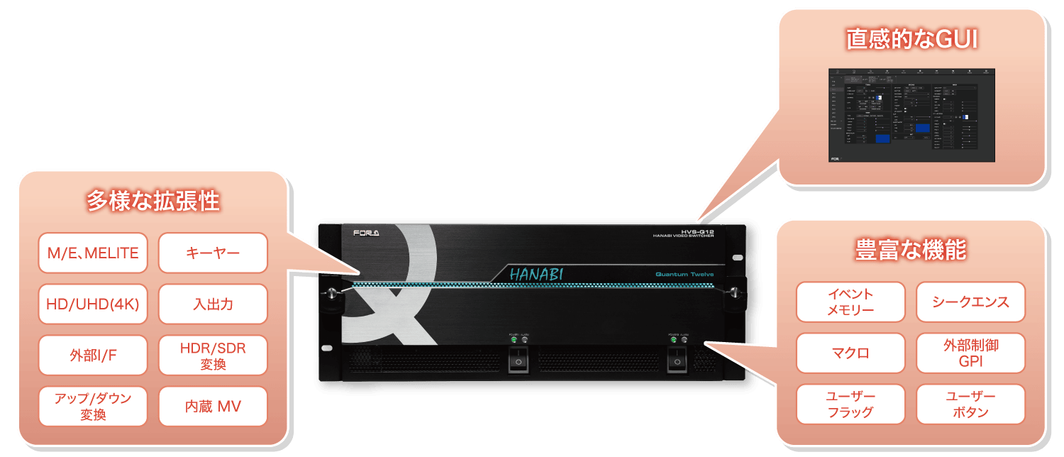 既存のHANABIシリーズで好評だったイベントメモリーやシーケンス、マクロ、外部制御用のGPI、ユーザーフラグやユーザーボタン機能等をそのまま継承。