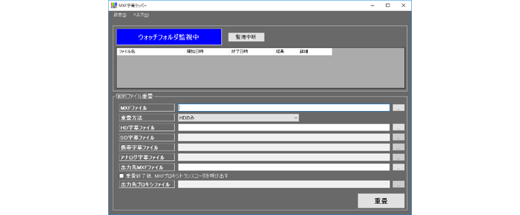 - ARIBファイル(HD/SD/携帯電話向け字幕)とNABファイル(アナログ放送字幕)をMXFファイルに重畳。