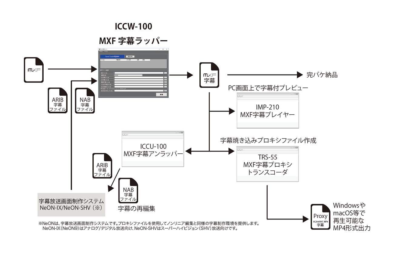 ICCW-100は、MXFファイルに字幕情報を重畳する