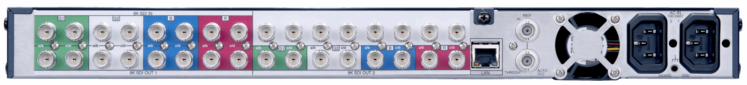 - 3G–SDI x 8の8K-DG(デュアルグリーン)信号と3G–SDI x 16の8K-422(フル解像度)信号に対応