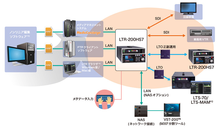 LTR-NAS (オプション) を追加すると、収録中に生成されるMXFファイルを外部のNASに出力し、編集後、LTOテープへの書き込みが可能です。