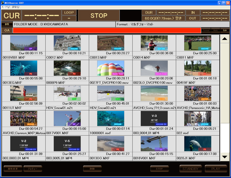 - コントロールソフトウェアはサムネイル表示により、登録されているクリップの内容を一目で確認可能(ファイルフォーマット、ファイル名、メタ情報、アイコンなど)