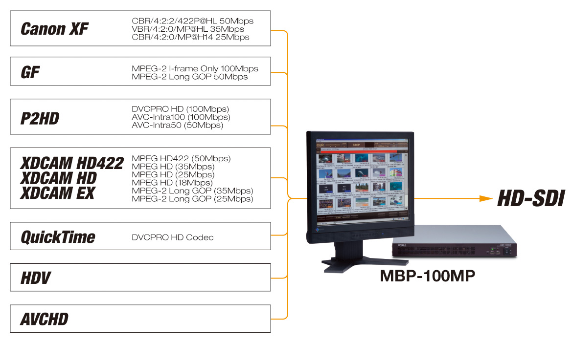 - カムコーダ等で収録したメディアを各社ドライブ経由でMBP-100MP に転送、HD-SDI のベースバンド信号にて出力