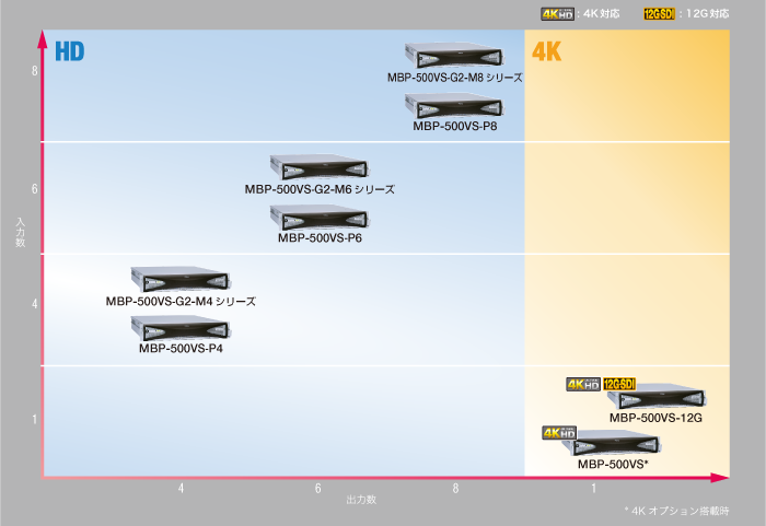 ハードウェアの組み合わせにより、4Kを1系統と、HDを4、6、8系統装備した4モデルから選択可能。