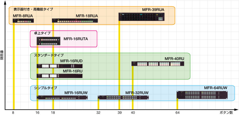 用途に合わせて10種類から選択可能です。最大127台まで接続でき柔軟なコントロール環境を構築可能。複数のリモートコントロールユニットを組み合わせることで、大型のコントロールパネルとして機能させることも可能。ラインアップならびに詳細はリモートコントロールユニットMFR-RUシリーズのページをご確認ください。