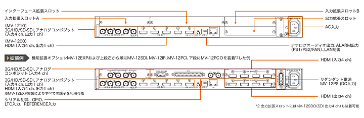 いずれのモデルも、機能拡張オプションMV-12EXP実装により、SDI/HDMI双方の入出力に対応 (8入力2出力に拡張されます)