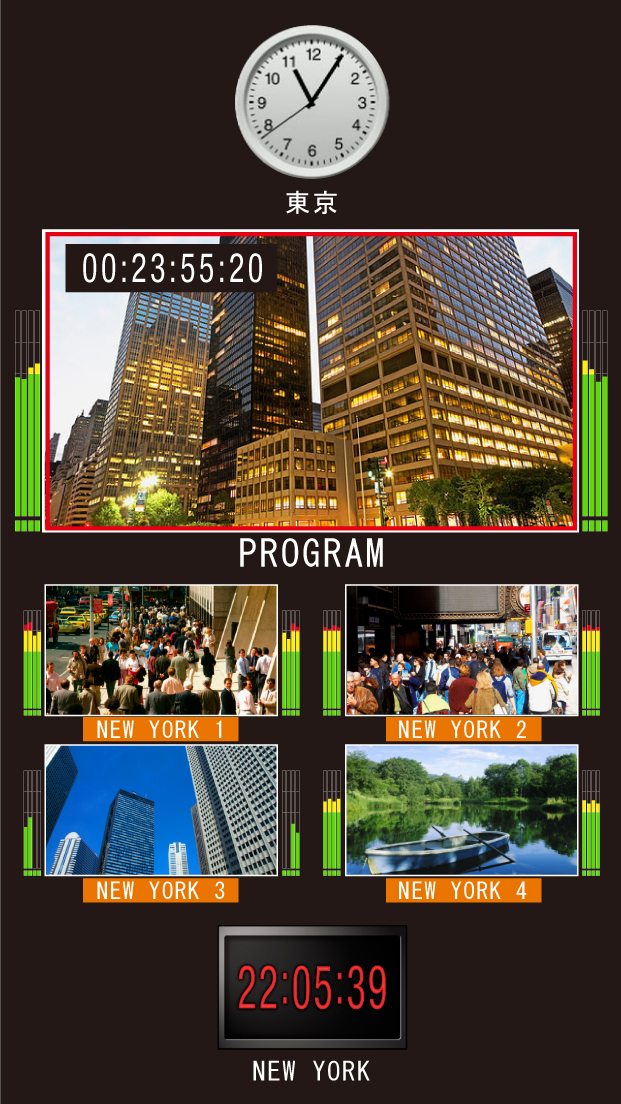 - タイトル表示:各ウインドウにタイトルを2つまで表示可能。英数字、記号だけでなく、漢字表示にも対応(最大16文字)し、映像内、映像外に表示可能です