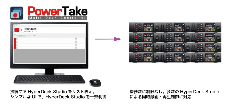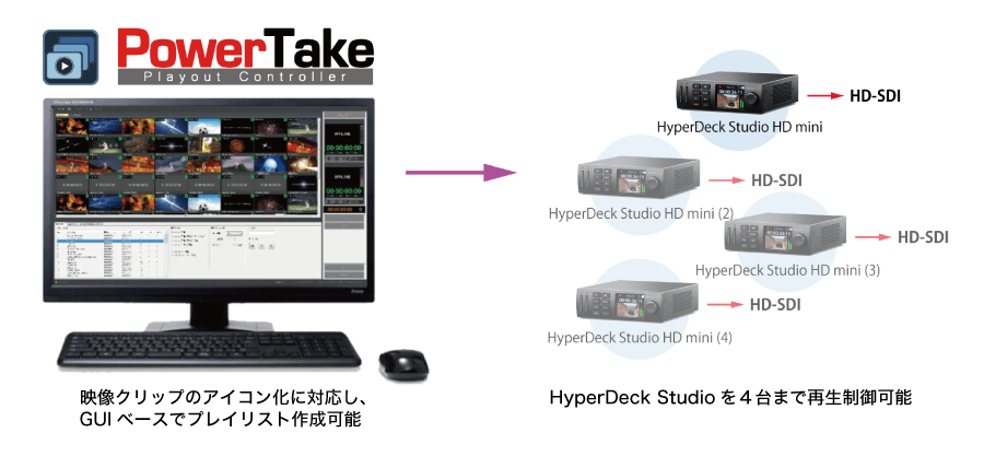 複数台のHyperDeck Studioを自在に操るコントロールソフトウェア。直感的なGUIで再生順序を指定できる Playout Controllerと録画・再生を一括でコントロールできるMulti Deck Controllerの2種類のソフトウェアを用意